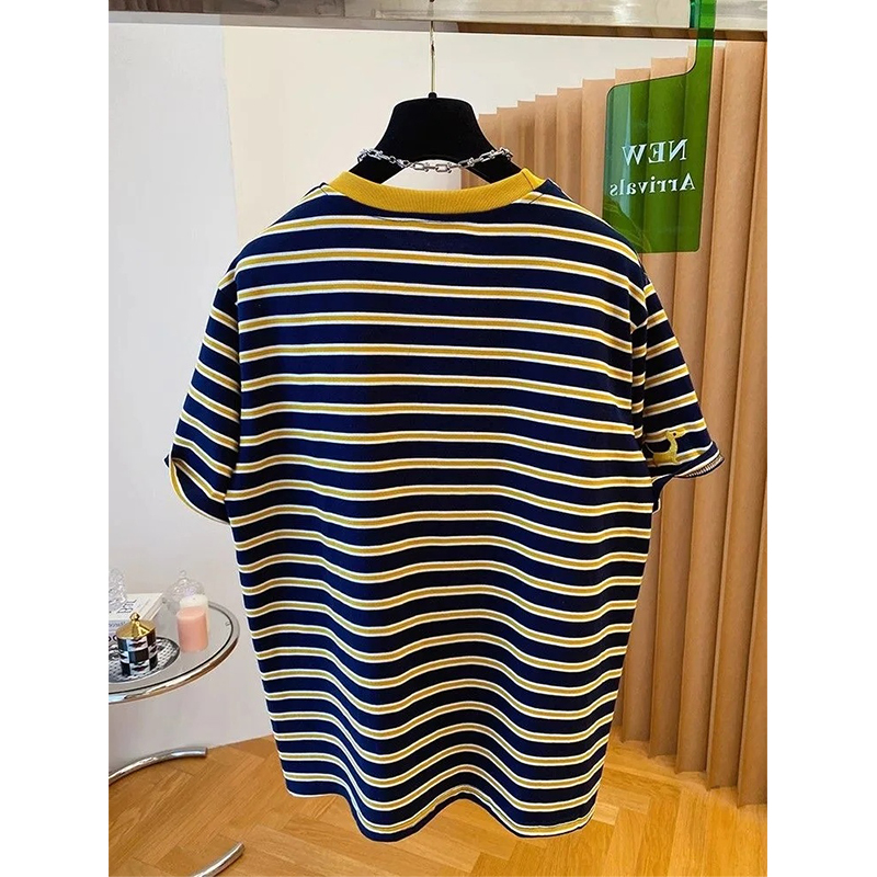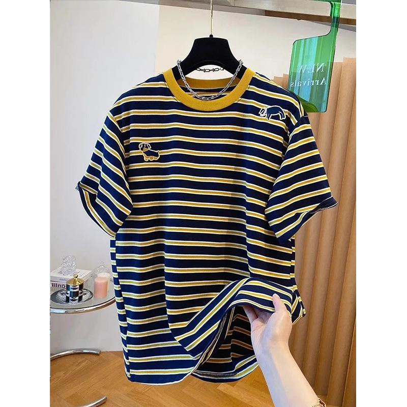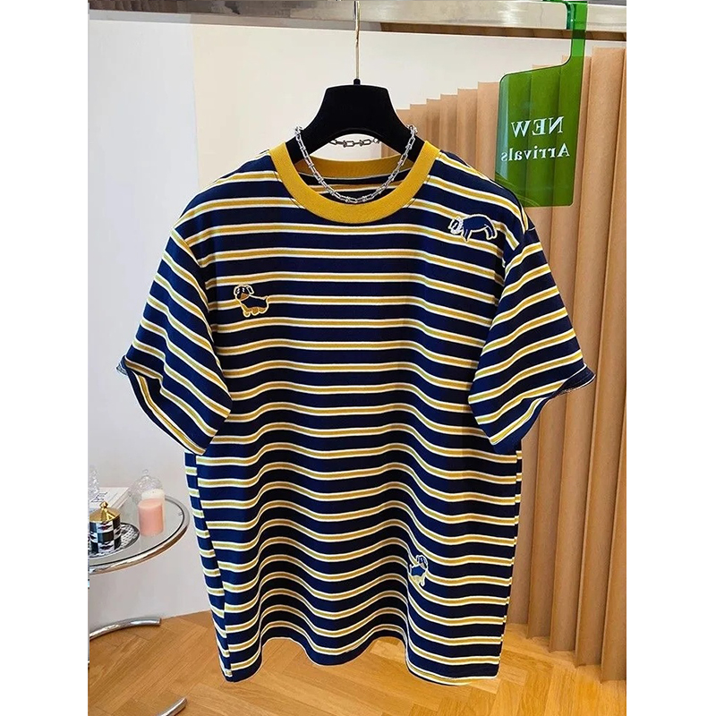 打底衫 条纹拼色短袖 宽松圆领小狗刺绣半袖 新款 上衣 t恤男2025夏季
