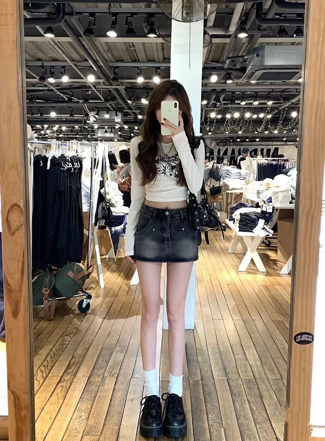 辣妹修身 美式 高腰露脐打底衫 t恤女春秋冬内搭短款 上衣服 复古长袖