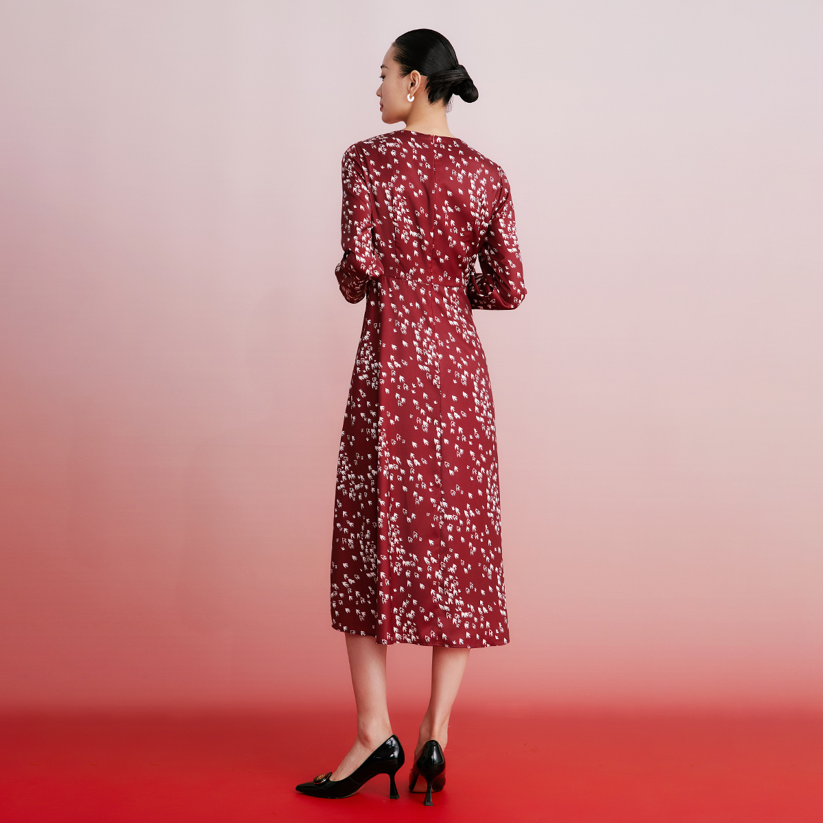 荷叶边宽松V领连衣裙 新款 MISSCOCOON可可尼长袖 印花裙子2025秋季