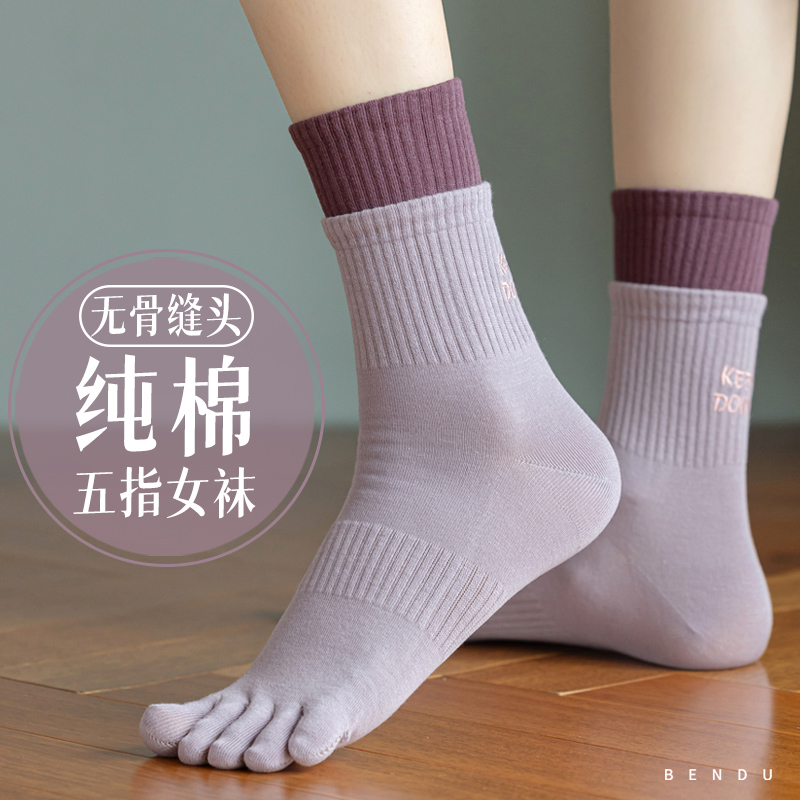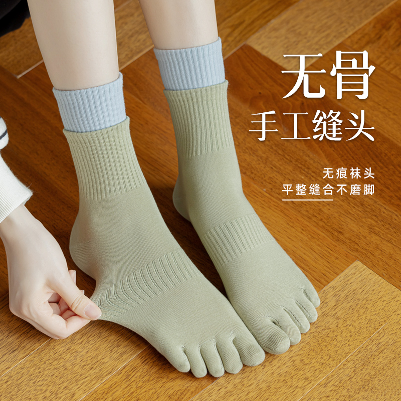 五指袜子女纯棉防脚气春秋季 分趾长袜 中筒袜全棉厚防臭运动秋冬款