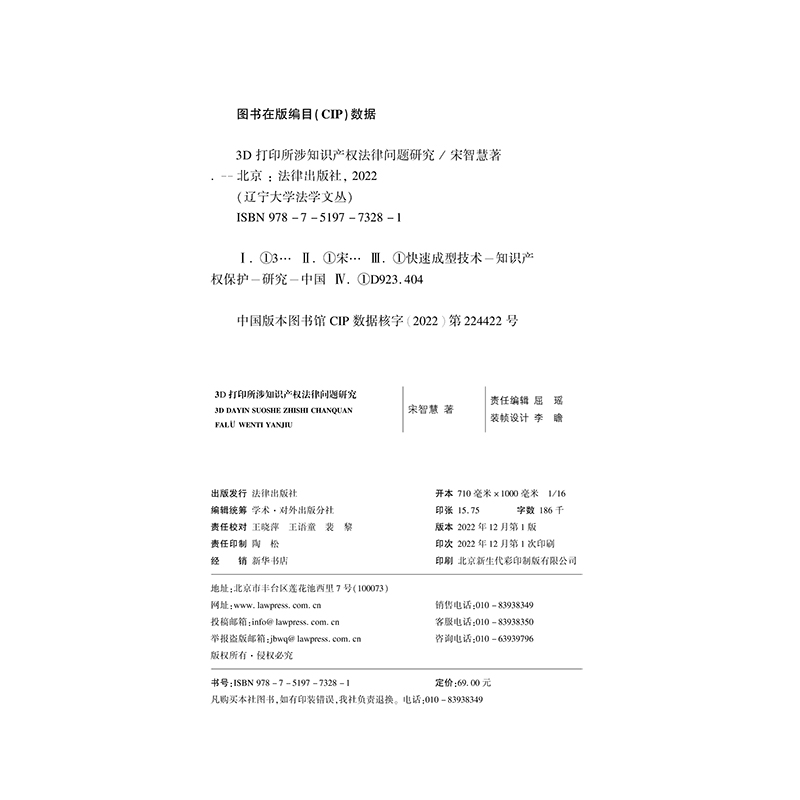 2022新书 法律出版 3D打印所涉知识产权法律问题研究 辽宁大学法学文丛 社9787519773281 宋智慧 正版