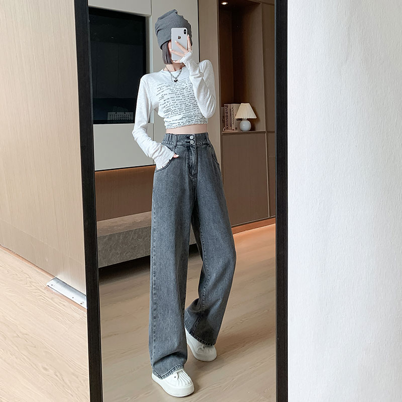女装 胖妹妹mm垂感显瘦学生阔腿裤 春秋季 黑灰色牛仔拖地裤 韩版 大码
