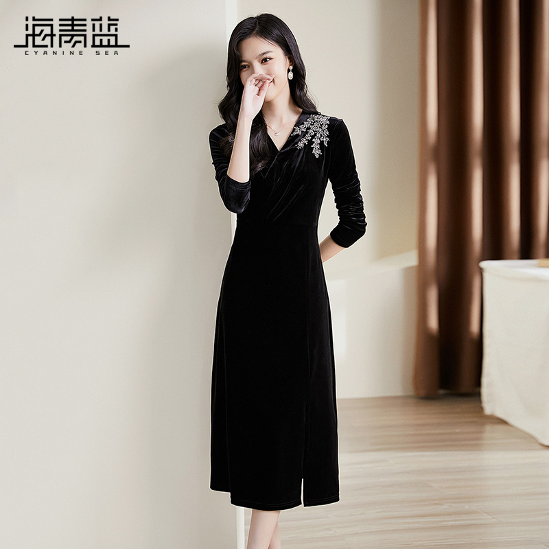 显瘦V领裙子 高端金丝绒修身 海青蓝洋气减龄黑色连衣裙女秋装 新款