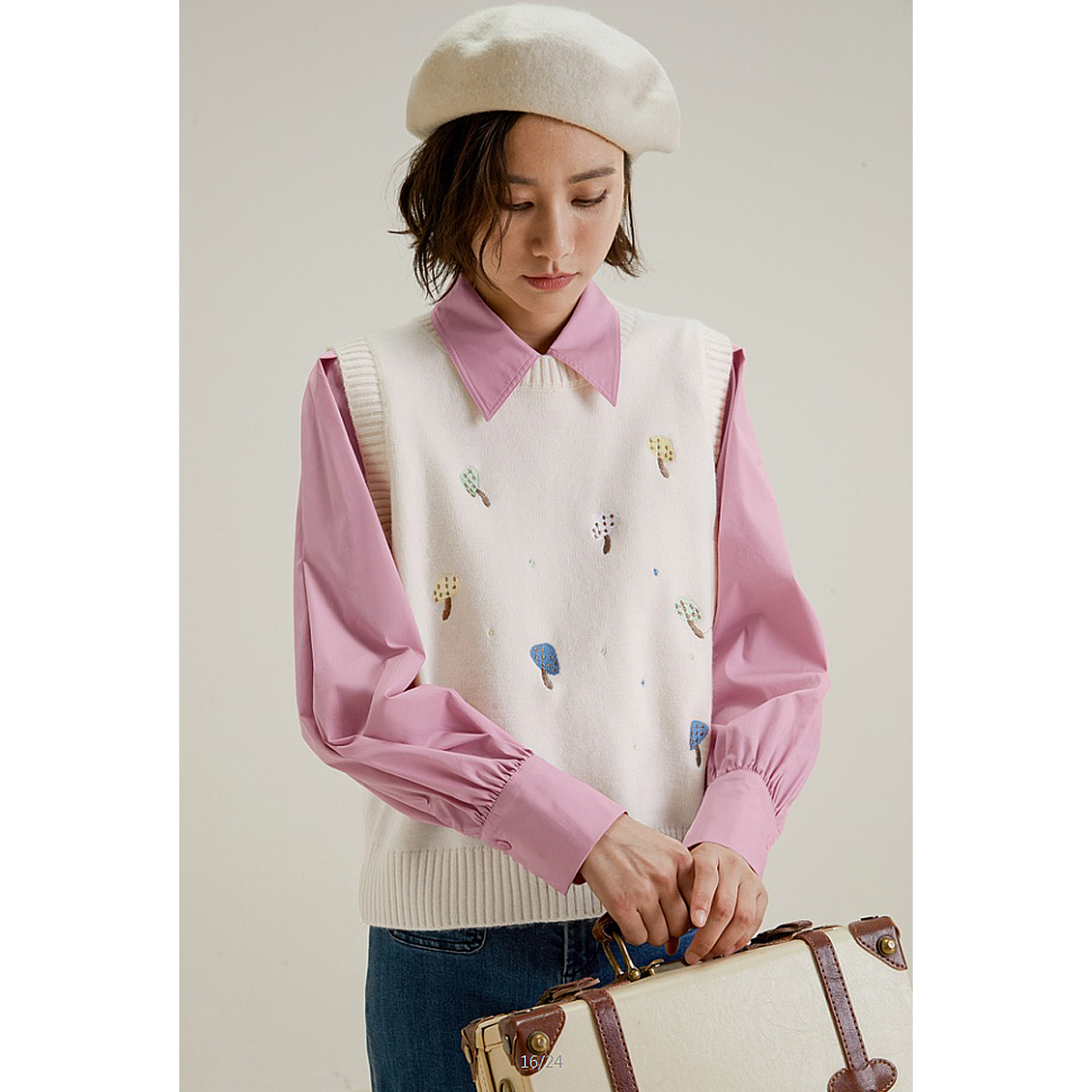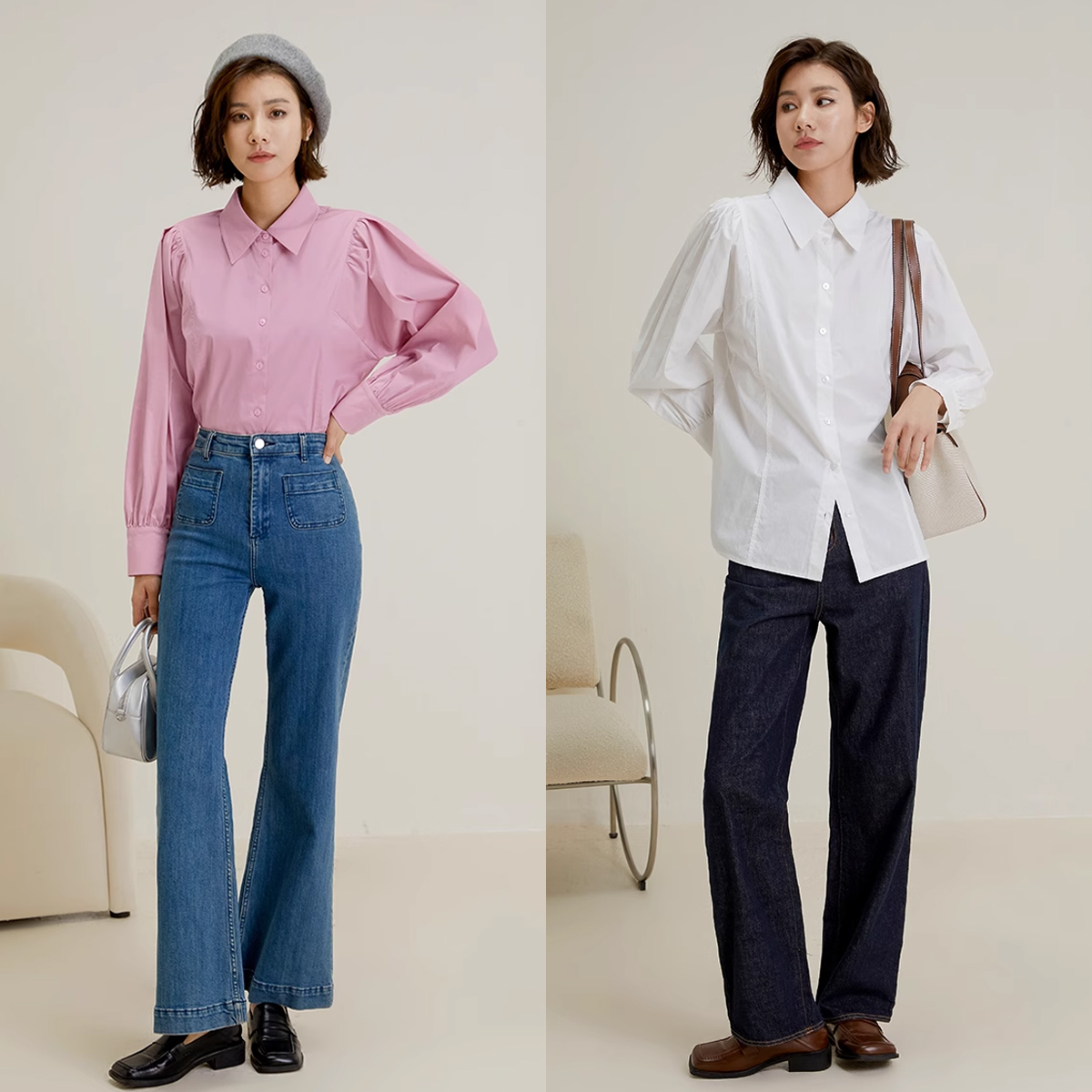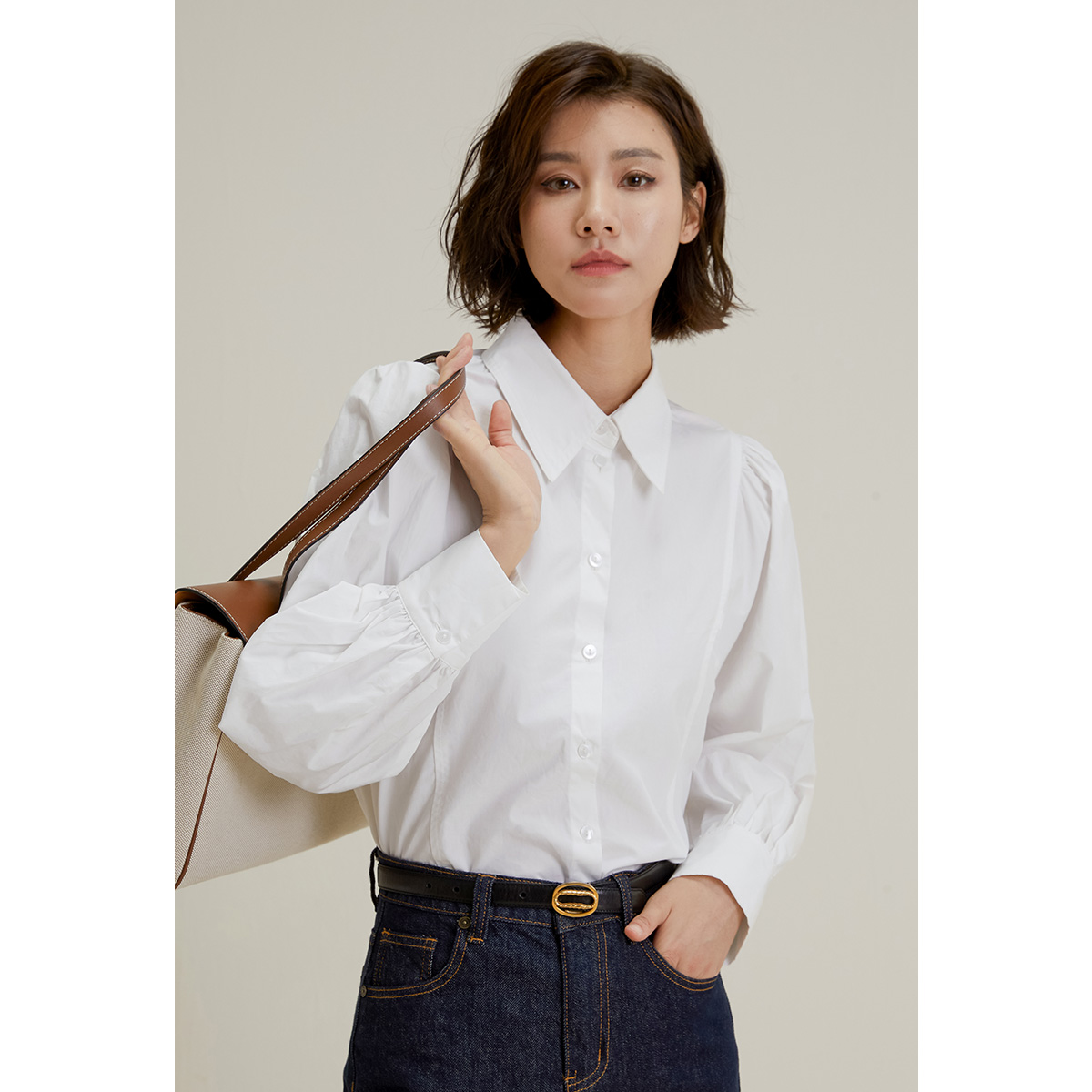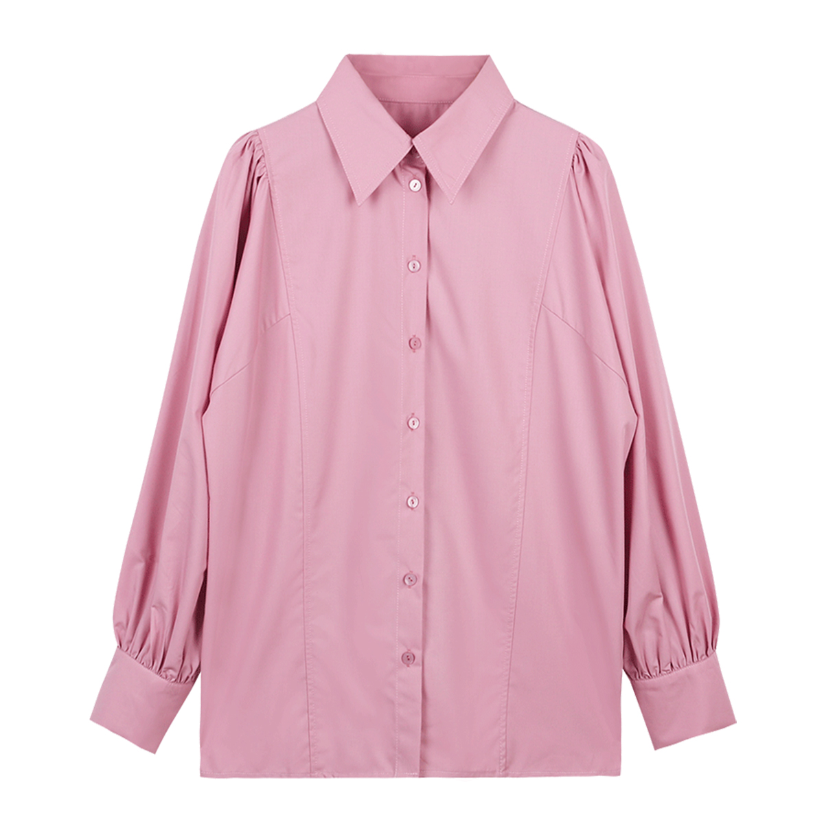 长袖 气质法式 粉色正肩泡泡袖 女上衣中长款 白衬衣 衬衫 弥古2025秋季