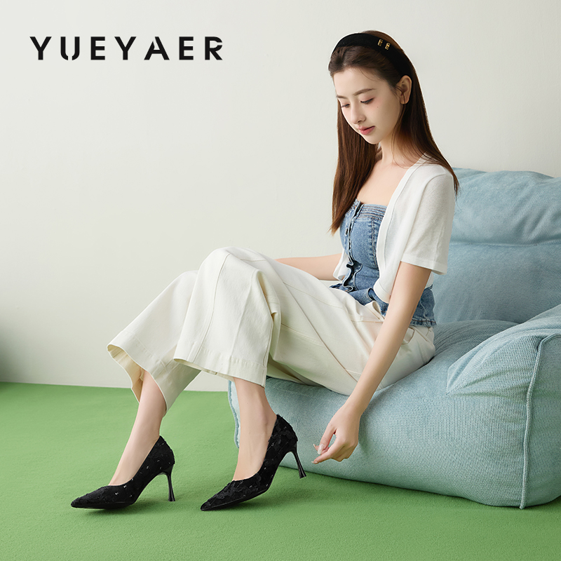 尖头浅口女鞋 月芽儿蕾丝玫瑰拼接单鞋 时尚 气质细跟高跟鞋 2025春季