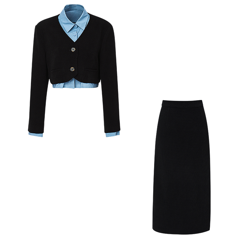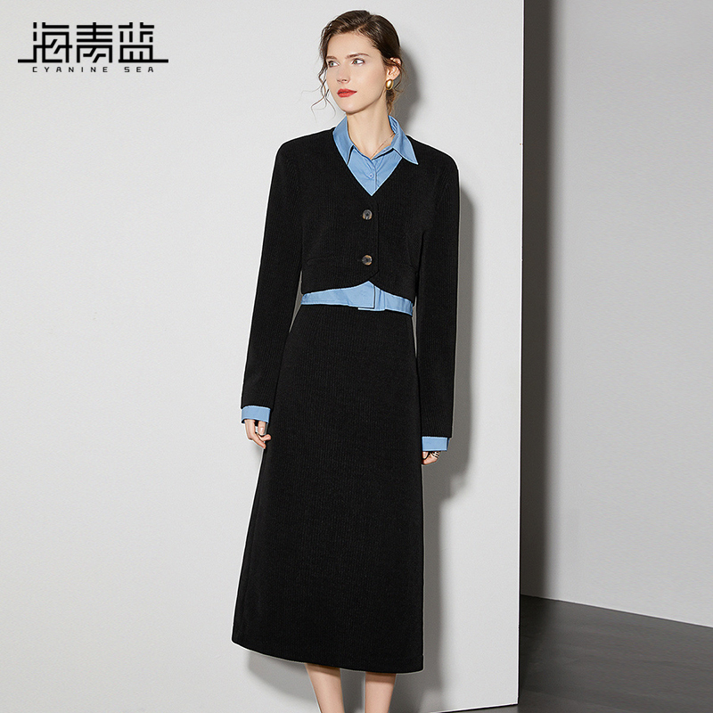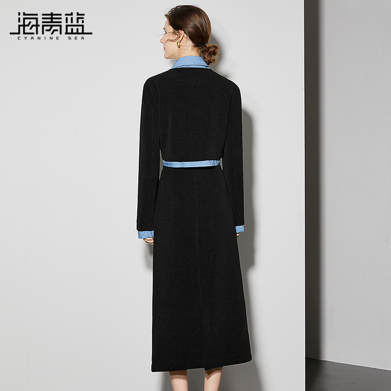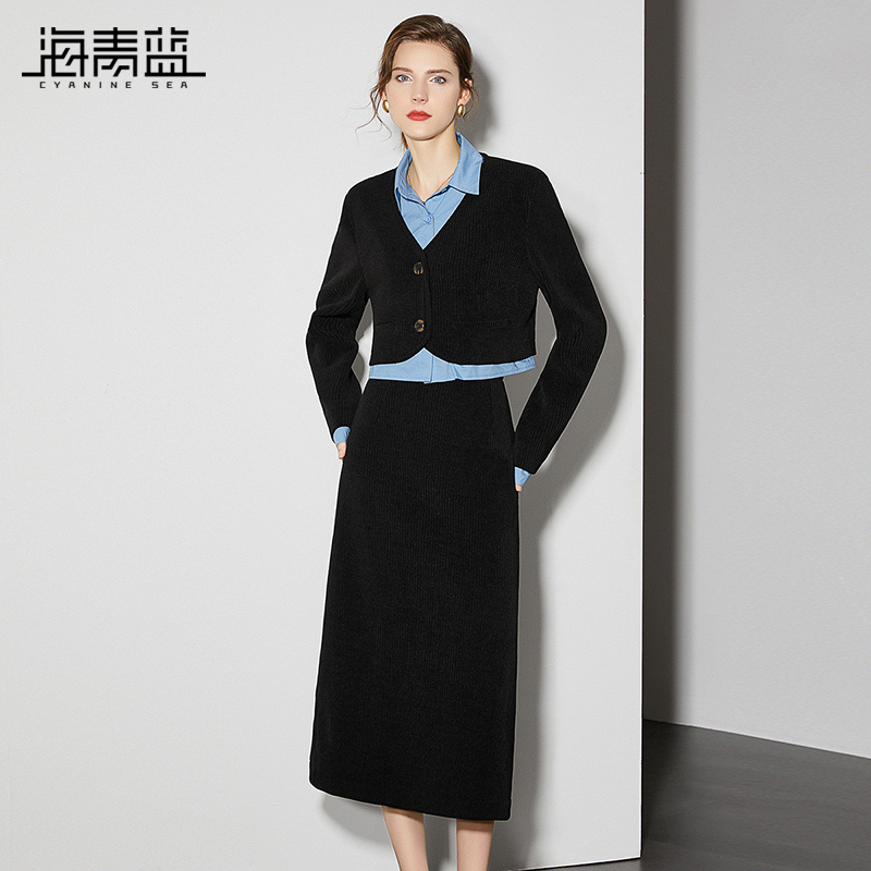 海青蓝复古风灯芯绒套装 女秋冬假两件外套半身裙保暖两件套