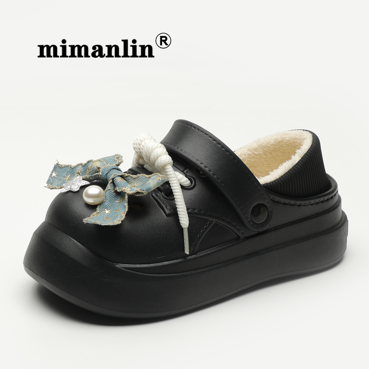 外穿棉鞋 秋冬防水防滑包跟棉拖鞋 女2024新款 蝴蝶结黑色加绒洞洞鞋
