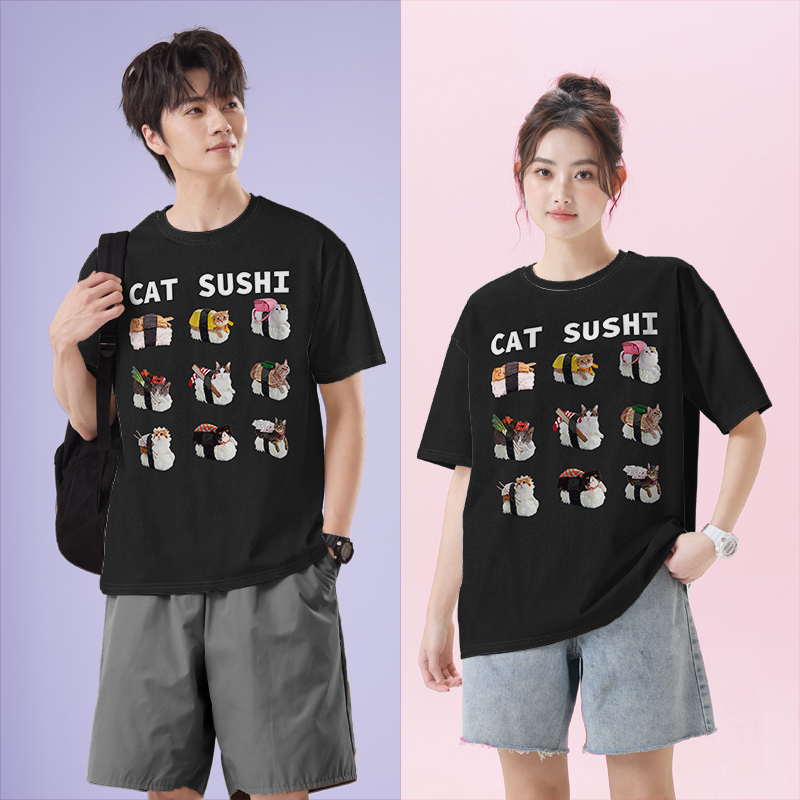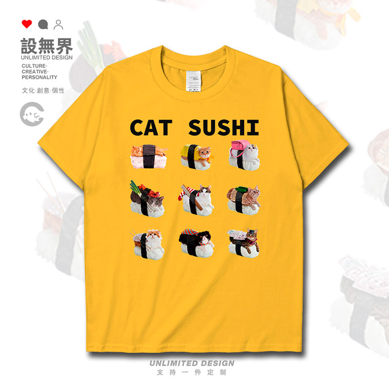 日系趣味寿司猫咪九宫格涂鸦卡通短袖 无界 T恤男女圆领体恤0017设