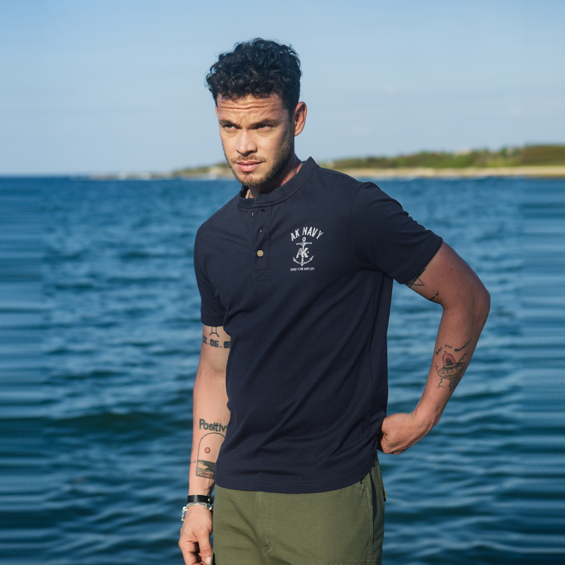 NAVY复古亨利领棉质干爽亲肤海锚印花短袖 新款 T恤男 夏季 AK男装