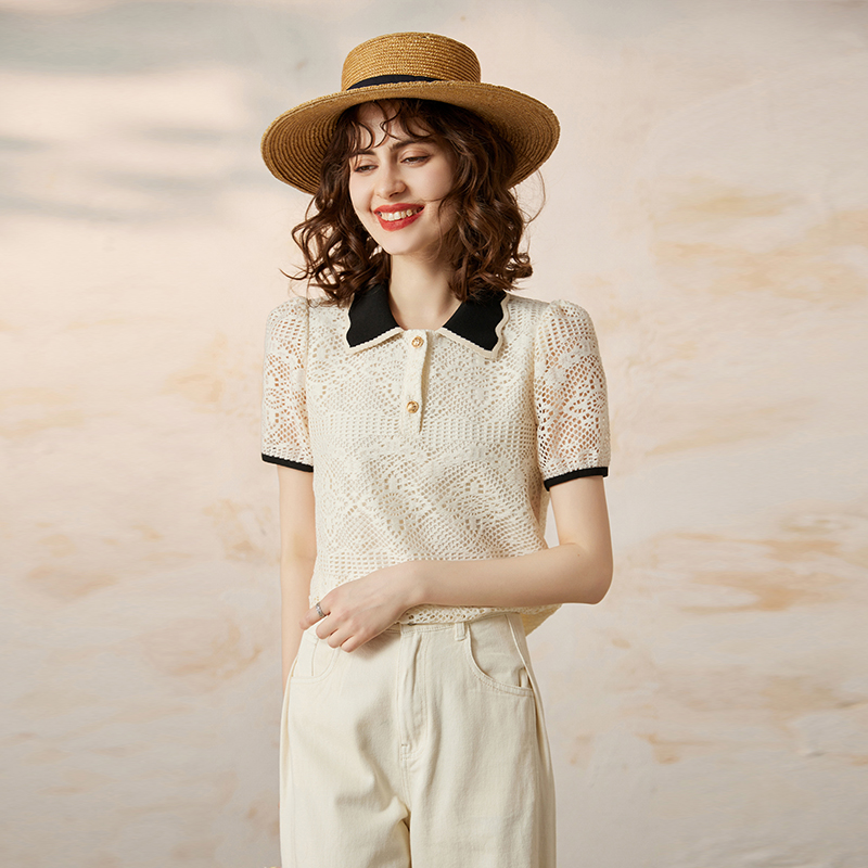 拼接撞色针织翻领短袖 白鹿语优雅气质镂空女式 法式 夏款 衬衣 衬衫