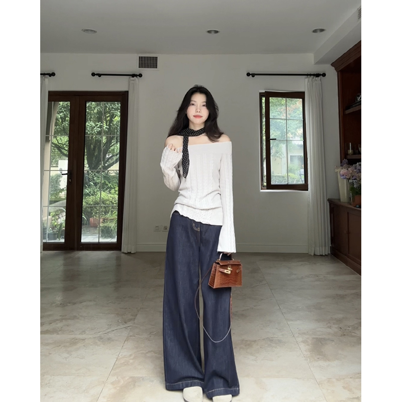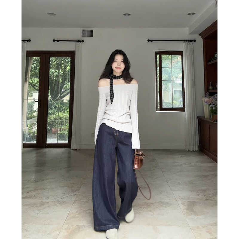 郭九九呢纯棉纯欲风露肩一字肩毛衣秋季 上衣送丝巾百搭阔腿牛仔裤