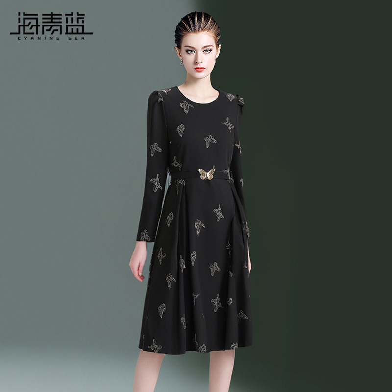新款 蝴蝶印花连衣裙2025秋季 气质收腰设计感裙子 泡泡袖 海青蓝法式