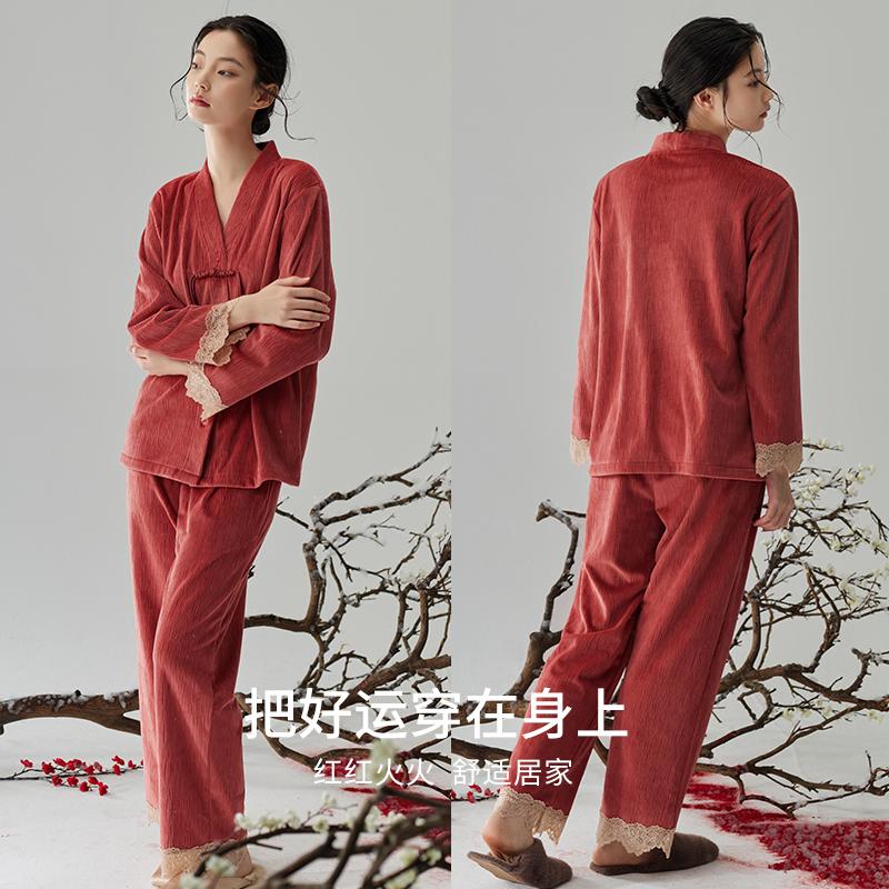 加厚保暖海岛绒珊瑚绒红色本命年家居服套装 轩靓新中式 睡衣女冬季