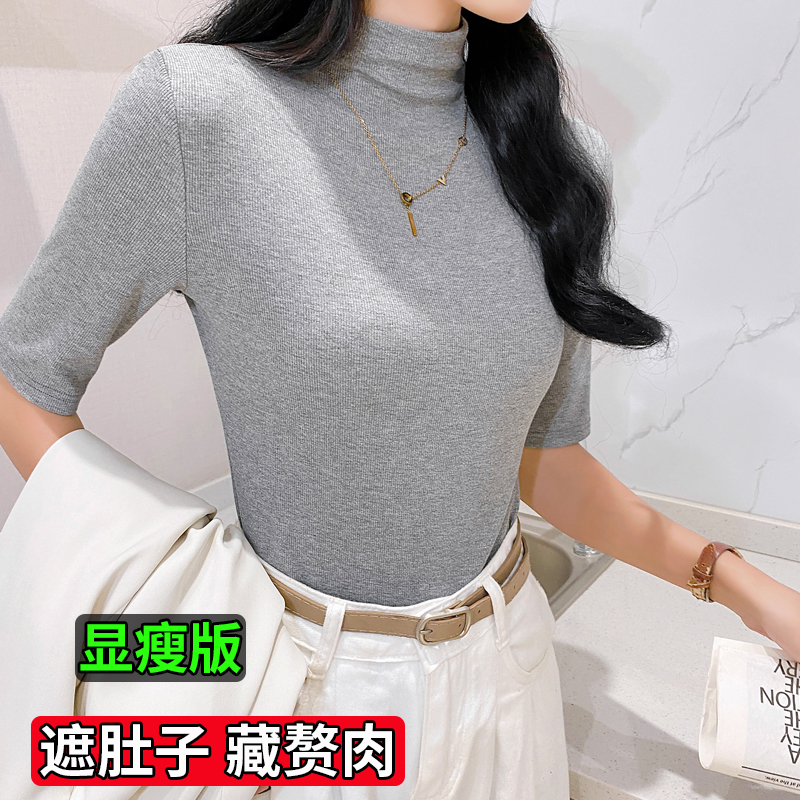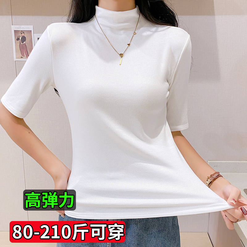 女2025新款 大码 打底衫 半袖 白色内搭高级感T恤上衣 胖mm半高领中袖