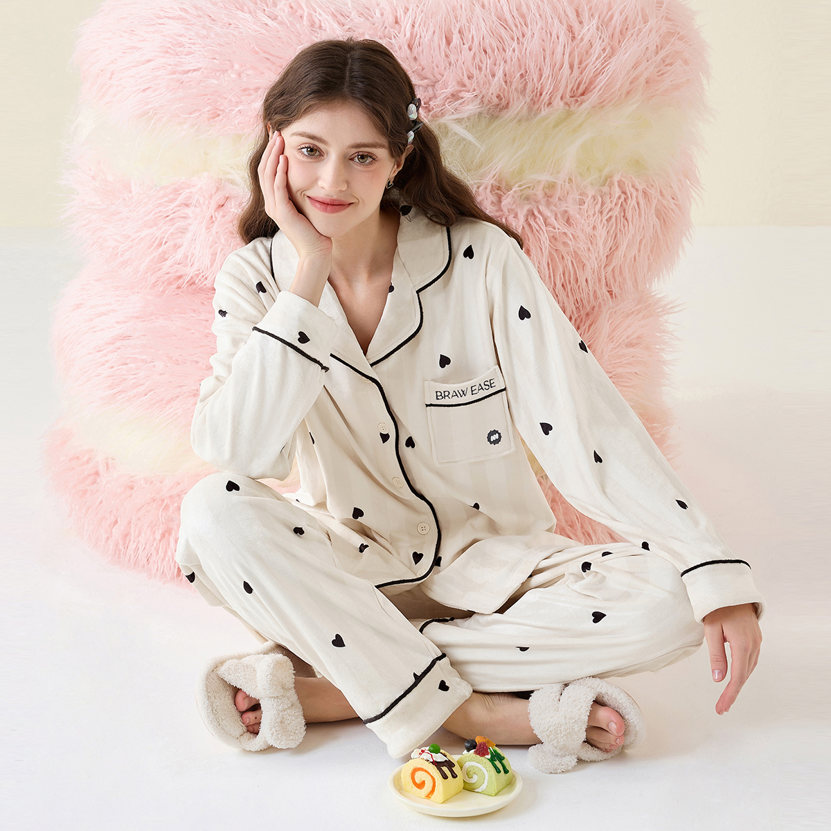 大码 春秋开衫 女士家居服 加厚珊瑚绒睡衣女冬法兰绒加绒套装 秋冬季