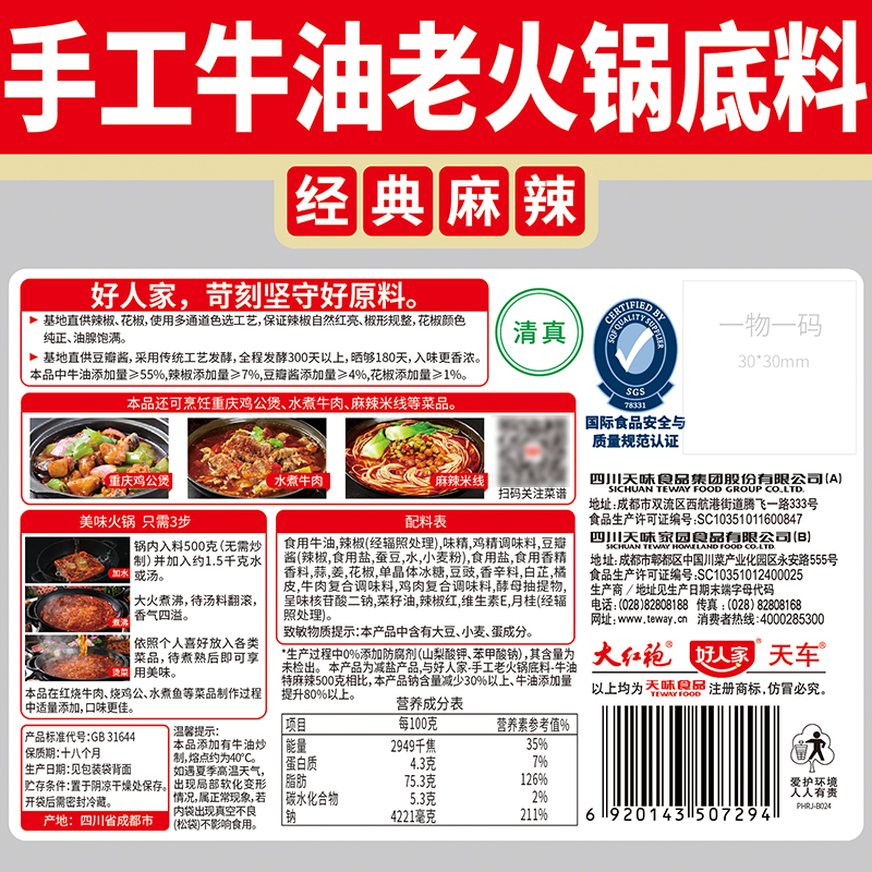 好人家手工牛油火锅底料500g经典 麻辣减盐30%特麻辣老火锅料小块