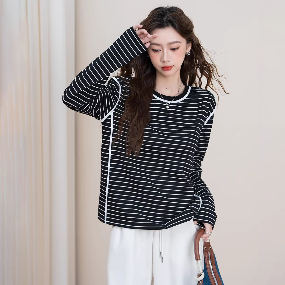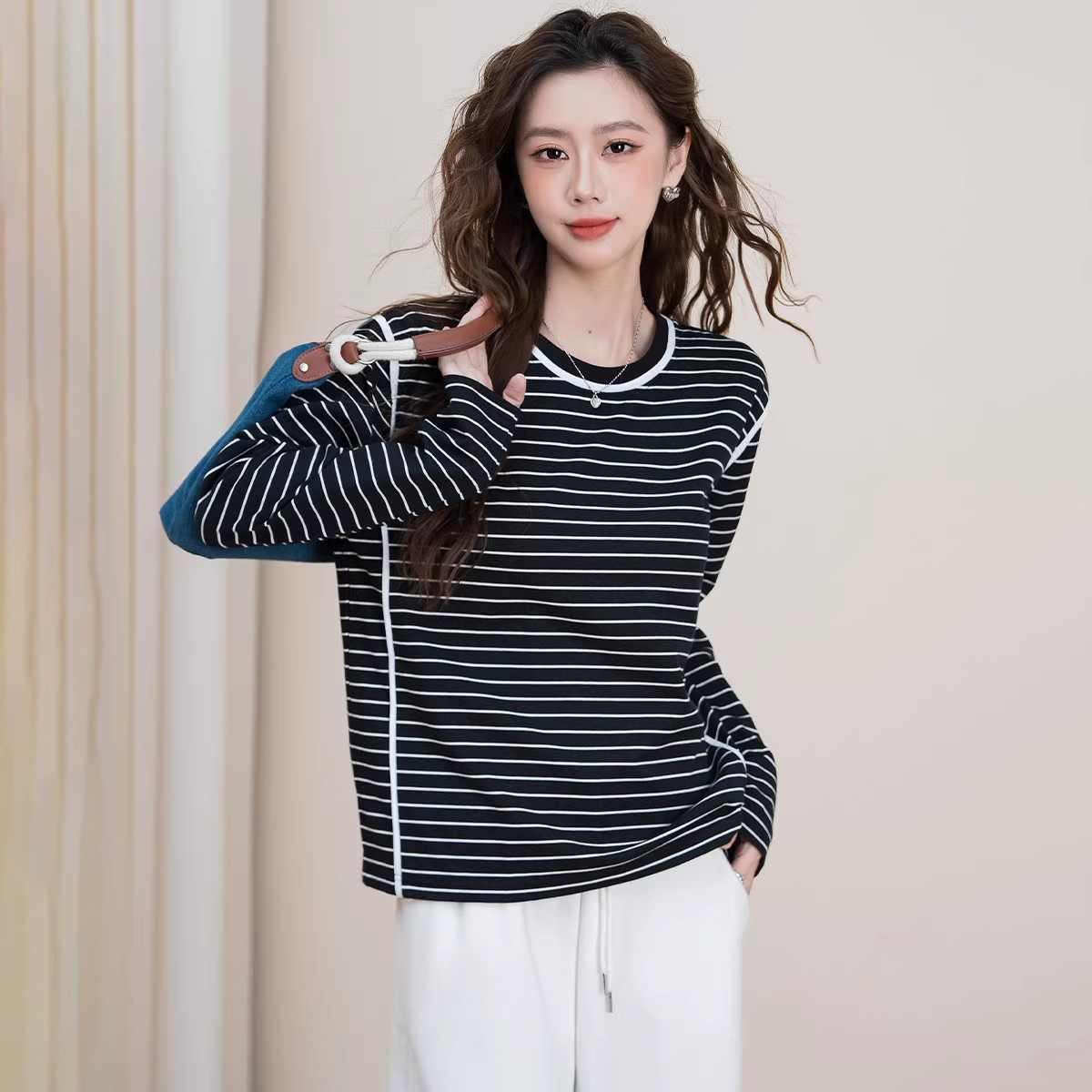 长袖 条纹2025秋季 T恤女宽松舒适休闲气质打底上衣J 经典 班尼路时尚