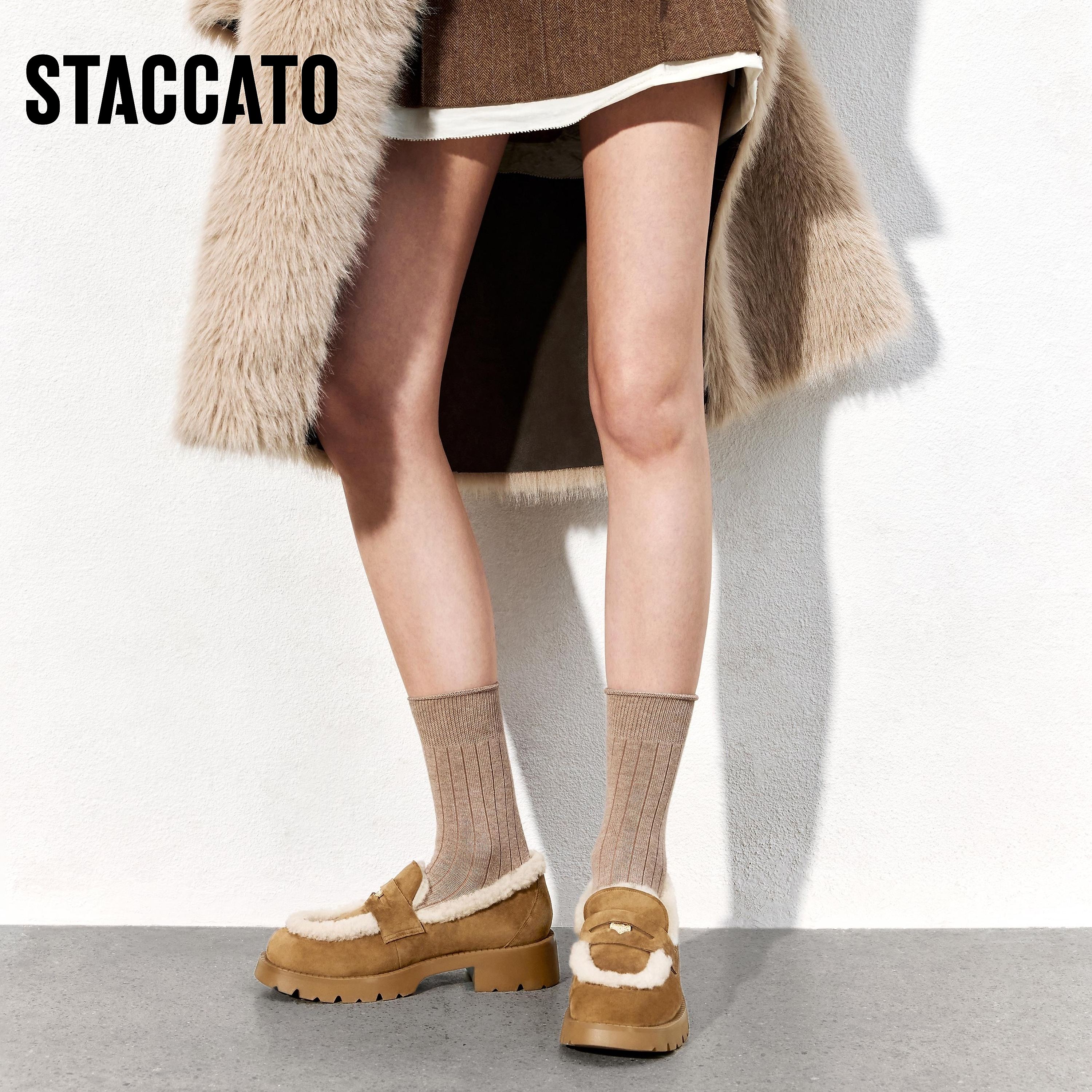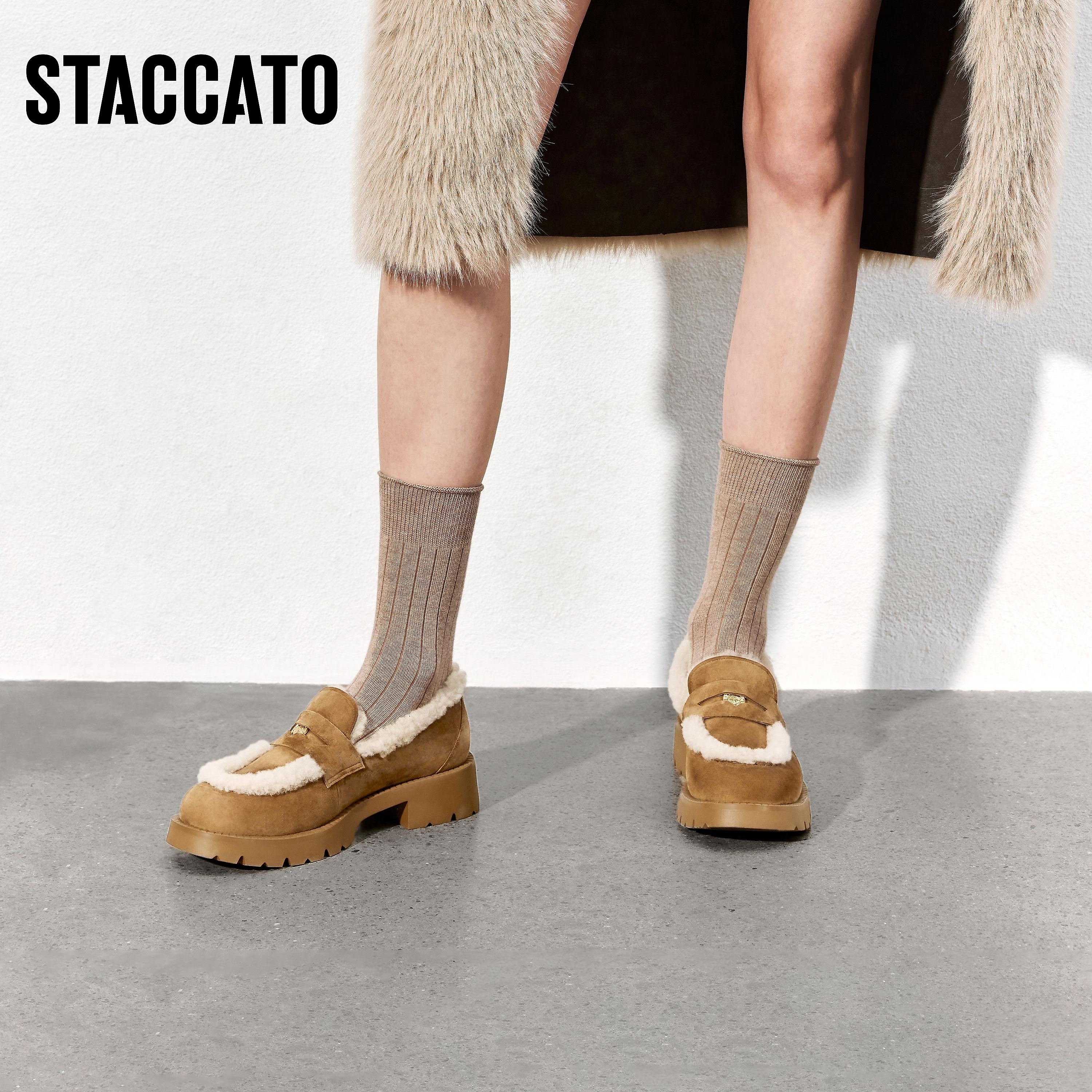 厚底增高女皮鞋 保暖乐福鞋 9YJ54AA5 复古毛毛鞋 思加图2025新款