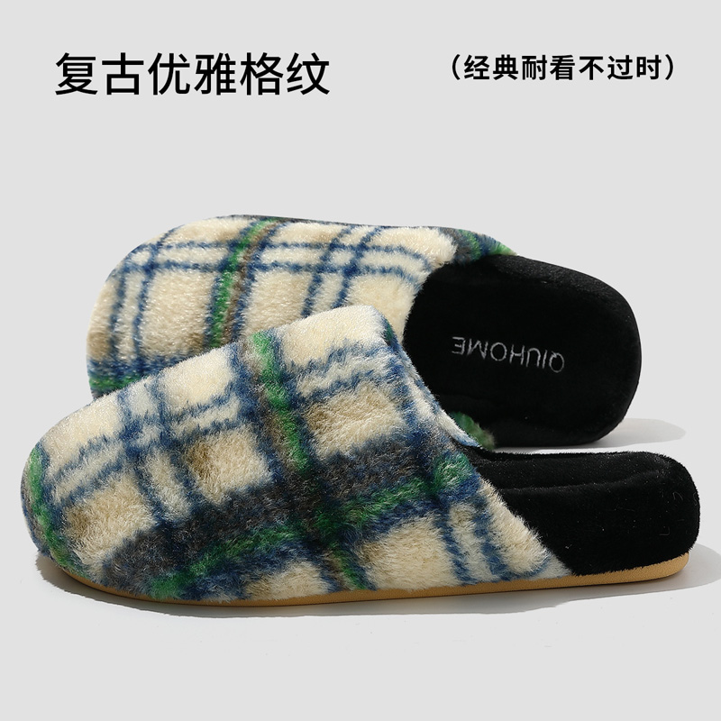 格子室内家居毛绒保暖软底防滑情侣拖鞋 时尚 男外穿 女秋冬季 棉拖鞋