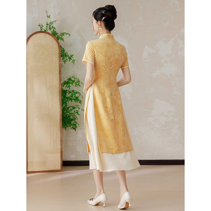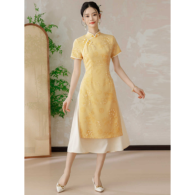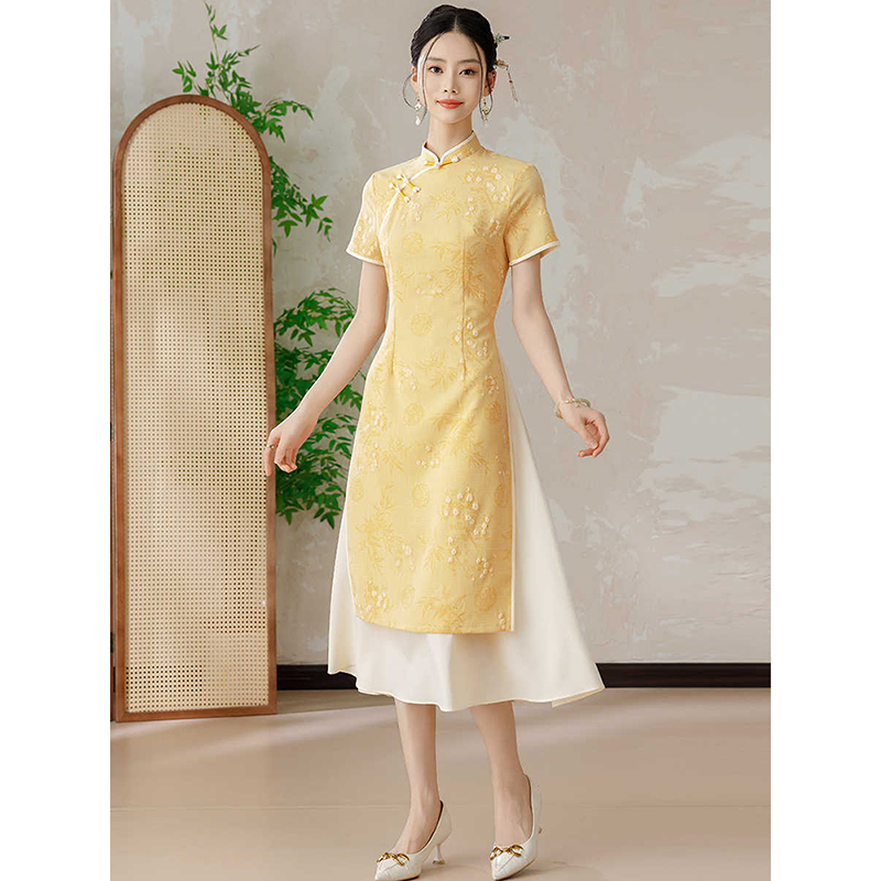 气质收腰显瘦送考61提花 改良旗袍裙2025夏季 新中式 黄色无袖