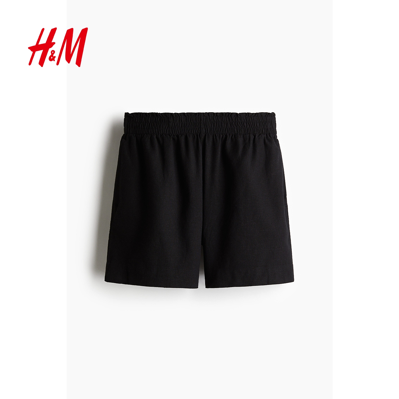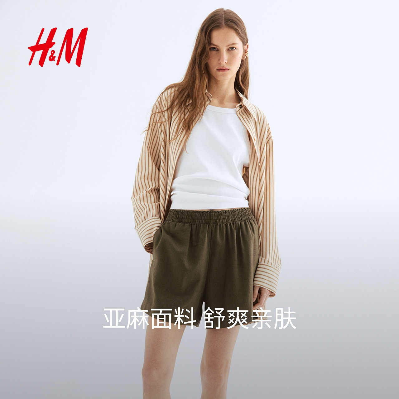 休闲松紧腰直筒亚麻混纺短裤 HM女装 新款 2025秋季 1259175 休闲裤