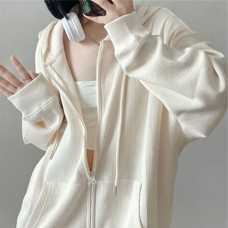加绒加厚 外套冬季 华夫格连帽卫衣女春秋oversize宽松薄款 拉链开衫