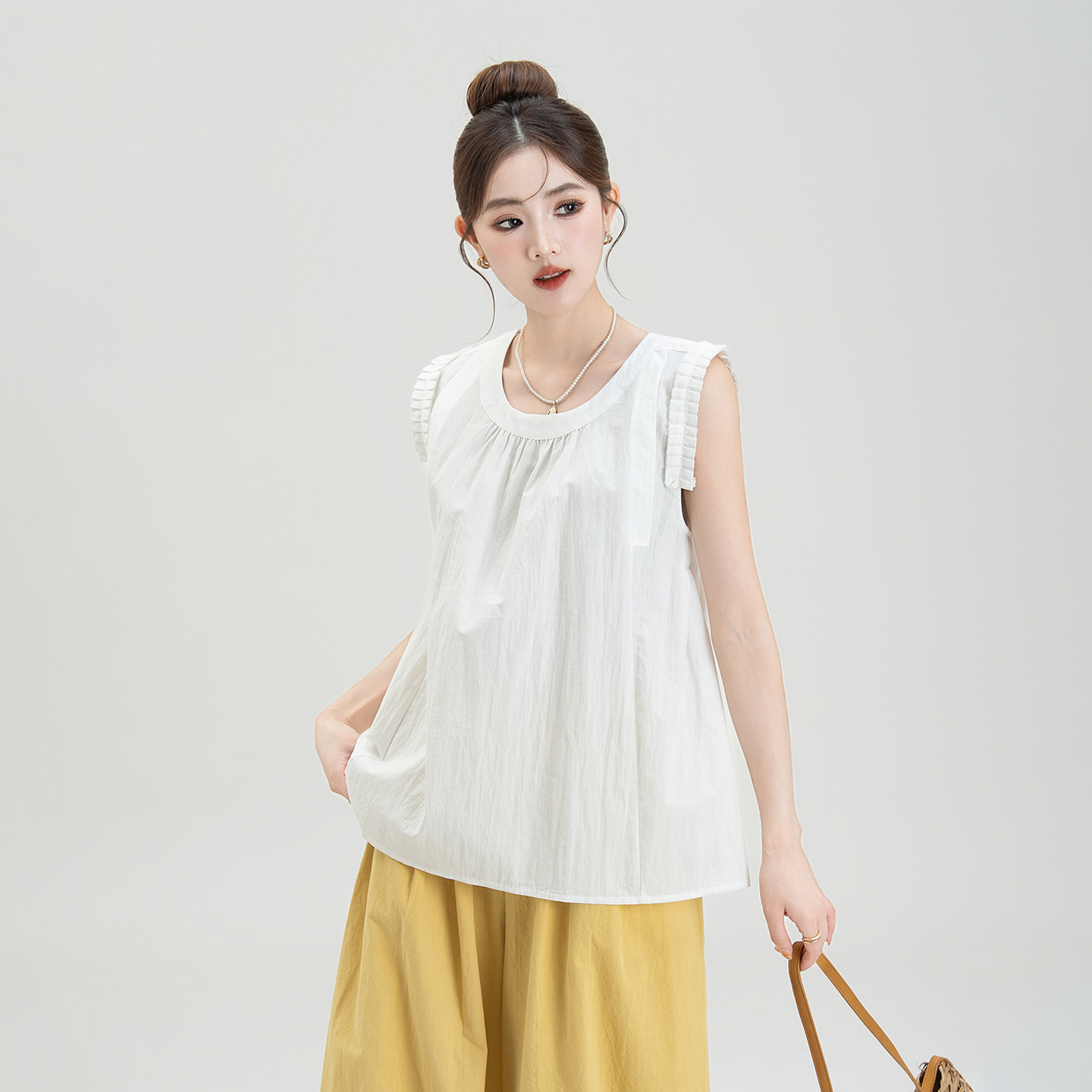 法式 白色压褶花边圆领无袖 新款 女夏季 甜美减龄宽松小上衣 背心衬衫