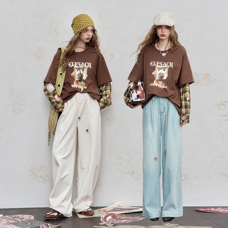 设计感小众上衣 t恤女2025早秋新款 妖精 口袋假两件格子印花长袖