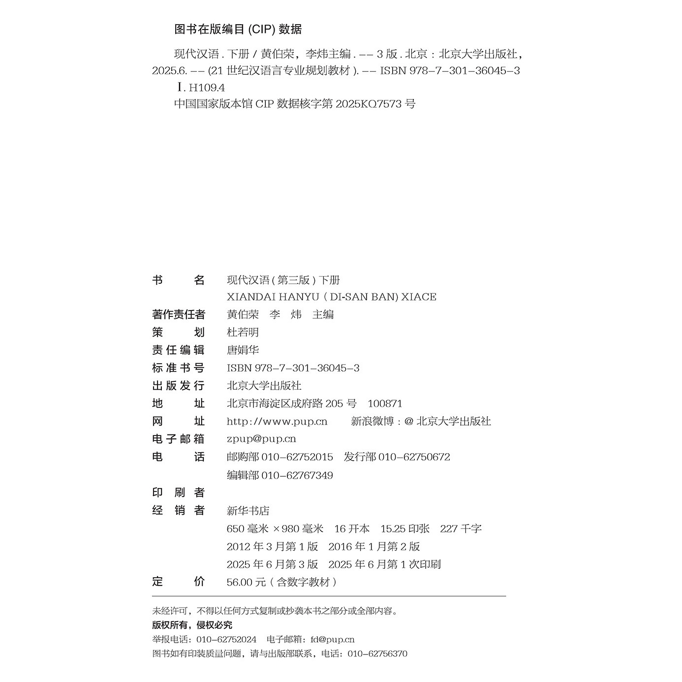 21世纪汉语言专业规划教材·专业基础教材系列 黄伯荣 李炜 现代汉语 社 下册 北京大学出版 9787301360453 第三版