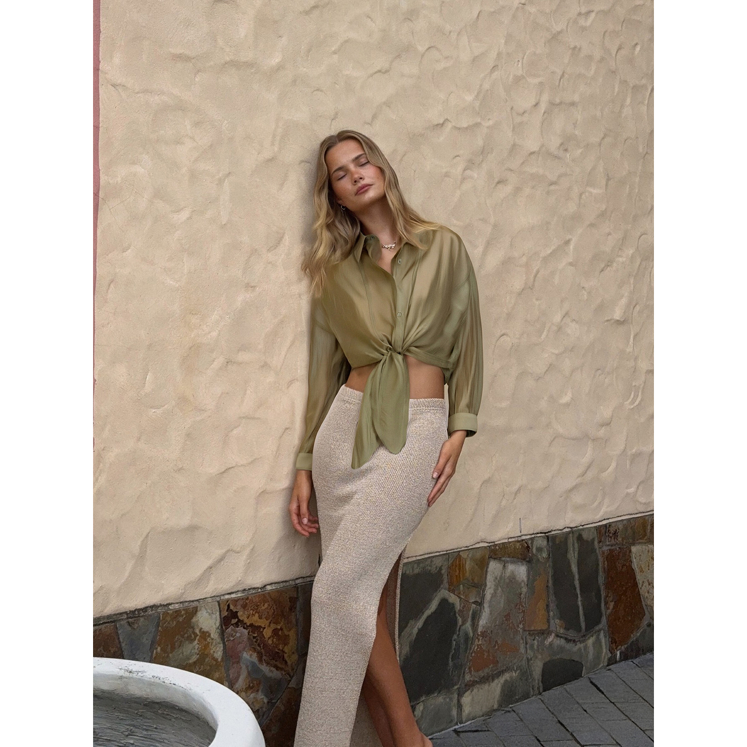 2025早秋新品 衬衫 米白色时髦百搭上衣女 try镂空编织廓形短款 wana
