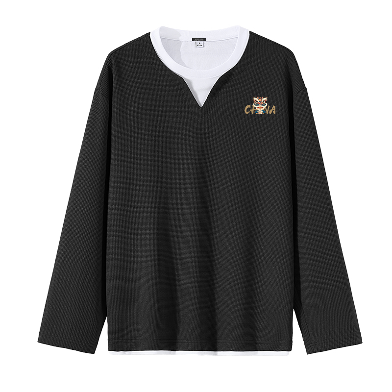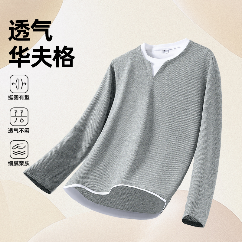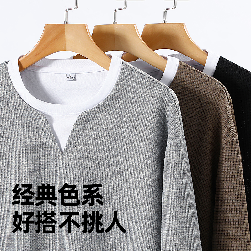 男款 华夫格圆领打底衫 宽松休闲上衣A T恤男秋季 GV真维斯假两件长袖