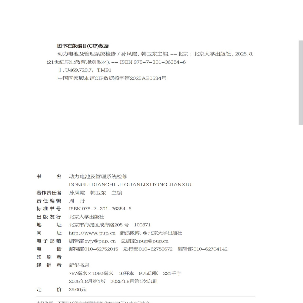 孙凤霞 汽车系列 韩卫东 北京大学出版 9787301363546 动力电池及管理系统检修 社 21世纪职业教育规划教材