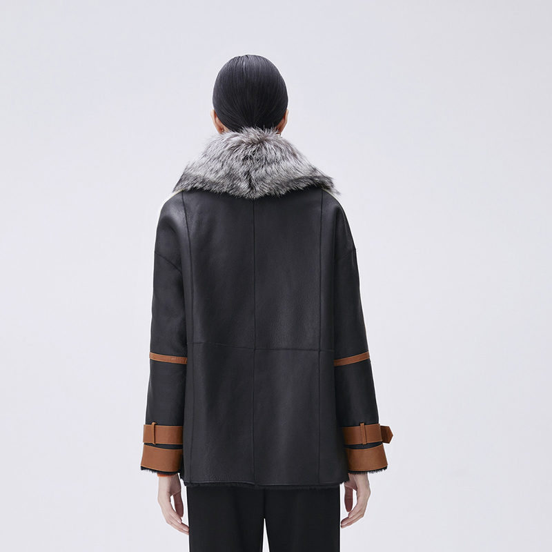 马天奴秋冬米色狐狸毛领皮草大衣外套拼接保暖轻奢时尚 气质流行女
