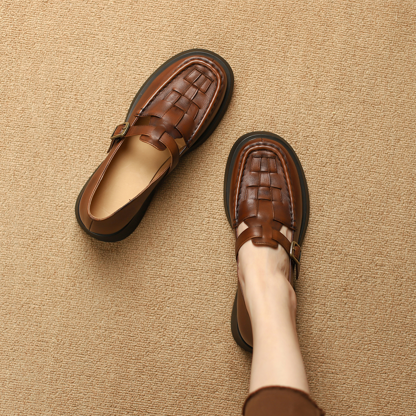 开怀依足头层牛皮编织西班牙小众乐福鞋 女真皮粗跟增高休闲豆豆鞋