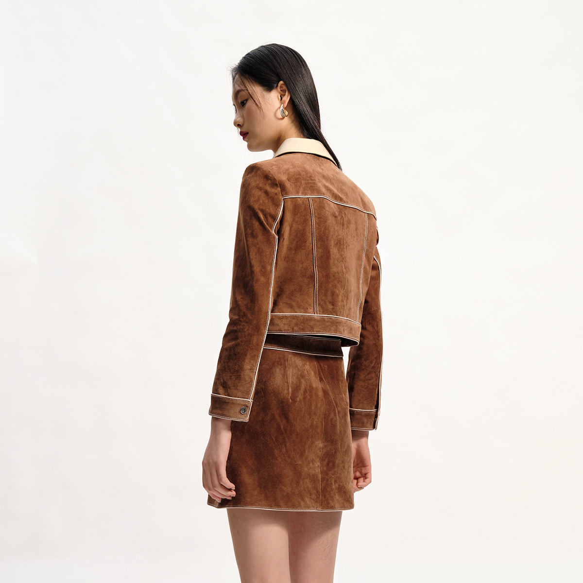 高腰撞色饰边猪剖层皮A字裙325311002 新款 Vero Moda皮裙2025秋季