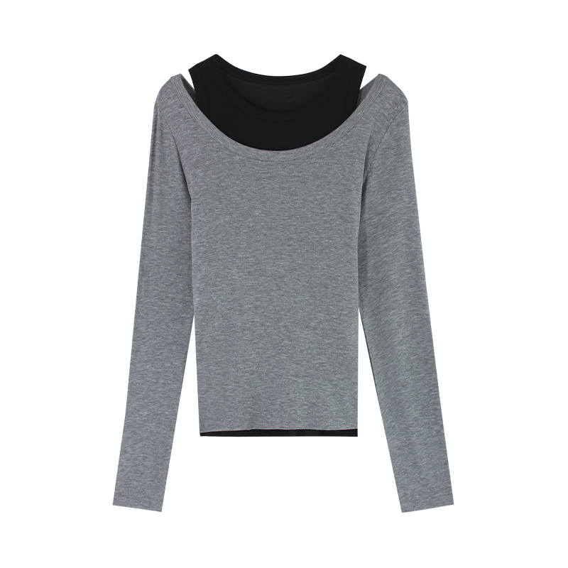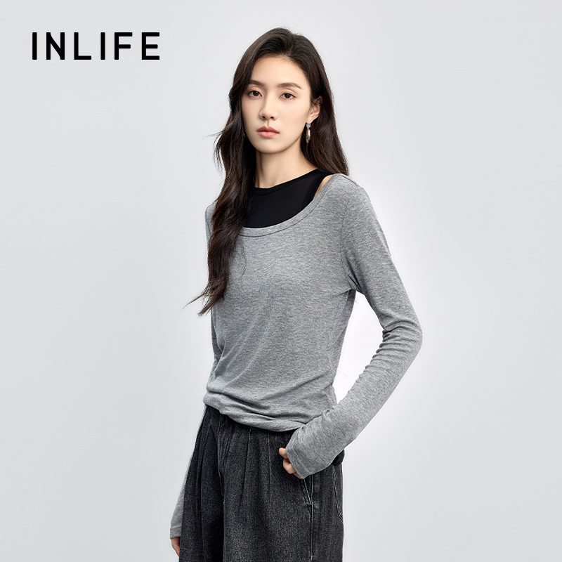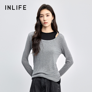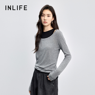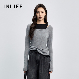 气质休闲打底衫 伊纳芙薄款 新款 T恤背心两件套女2025秋季 宽松长袖