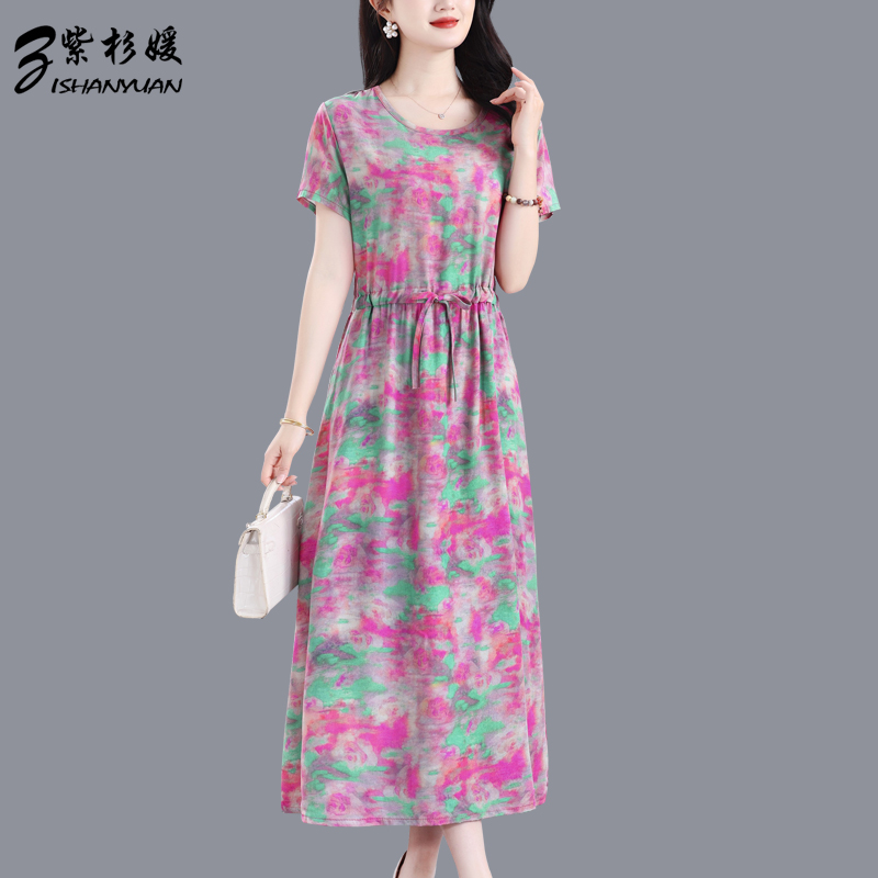 过膝 碎花沙滩裙长款 中年女士人造棉棉绸连衣裙新款 外穿妈妈年轻款