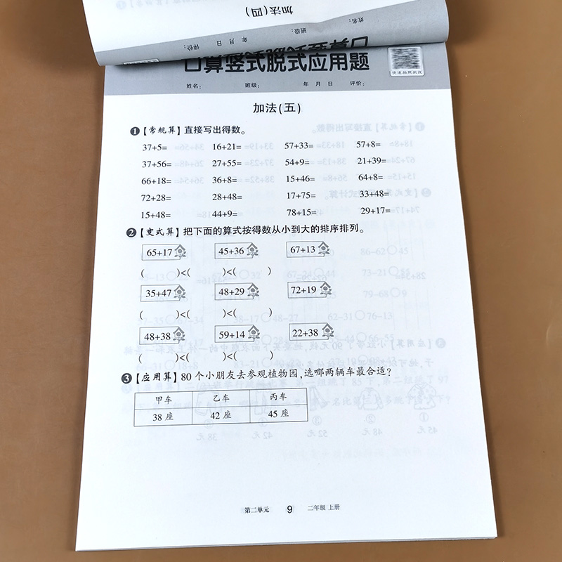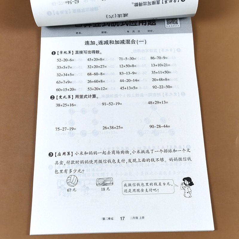 天天练计算题 应用题100以内加减法混合运算表内乘法练习题专项思维人教版 小学二年级数学同步训练活页练习册上册口算题卡竖式 脱式