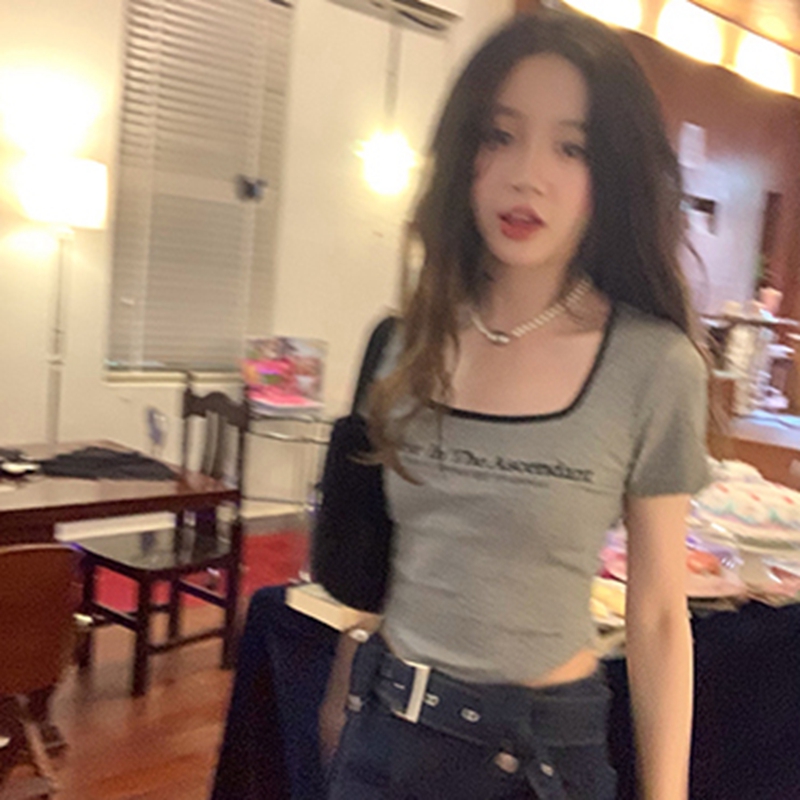 女 低胸紧身打底衫 纯欲甜酷U领性感露锁骨T恤女夏辣妹短袖 上衣短款