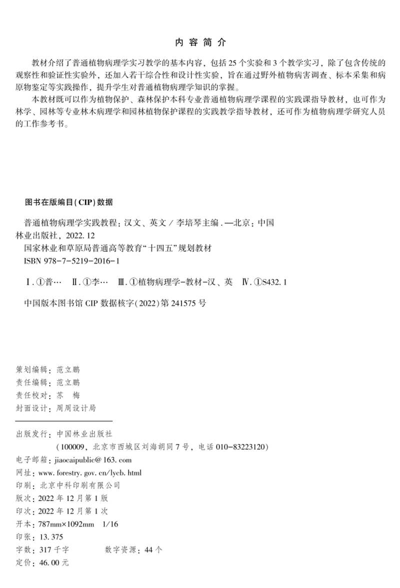 中国林业出版 普通植物病理学实践教程:汉文 2016 李培琴 社 中文