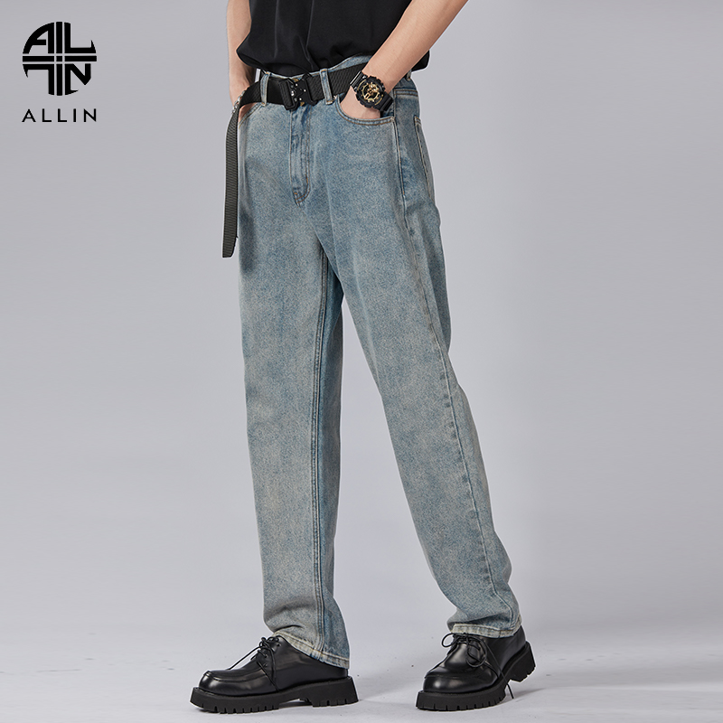 裤 ALLIN 男高街潮牌痞帅宽松直筒男款 复古水洗阔腿牛仔长裤 子 美式