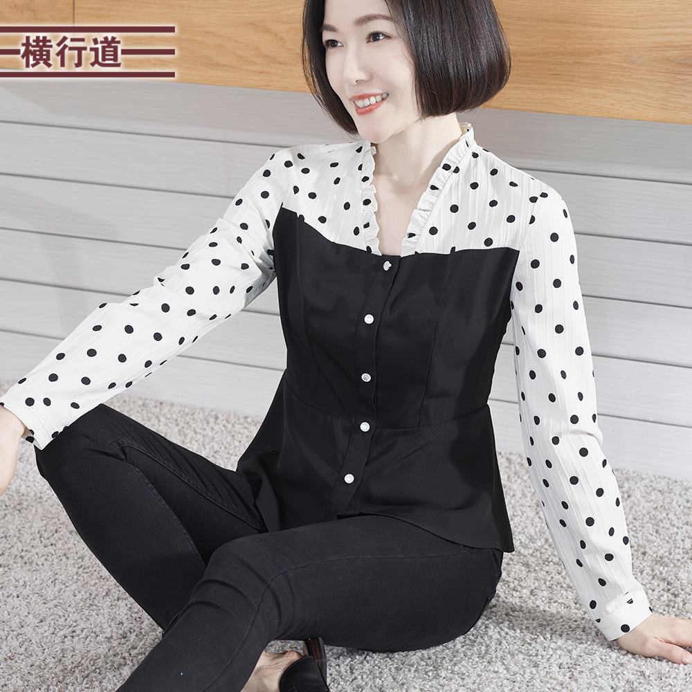 花边波点雪纺衫 2025秋季 鸡心领胖MM妈妈长袖 大码 V领上衣收腰韩版