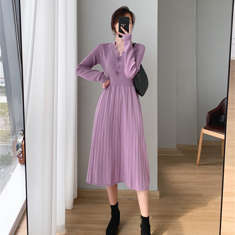 紫涵假两件翻领连衣裙女冬季 学院风设计感宽松休闲百褶短裙子 新款