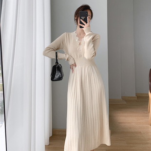 百褶裙子 别致高端精致优雅气质修身 菲梦伊卡其色连衣裙女秋装 新款
