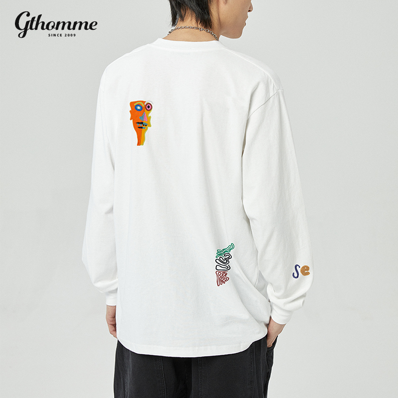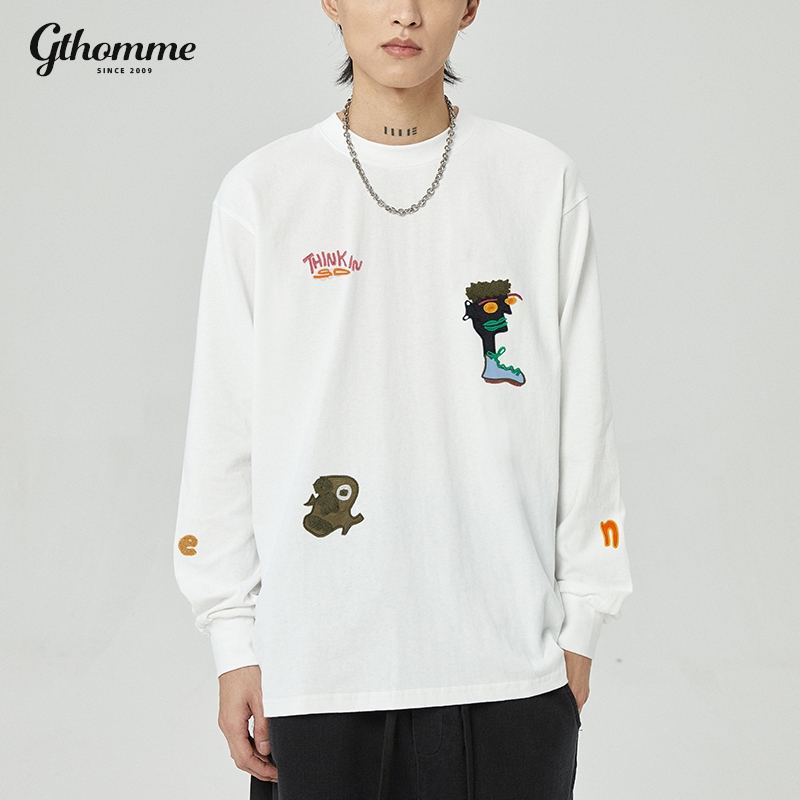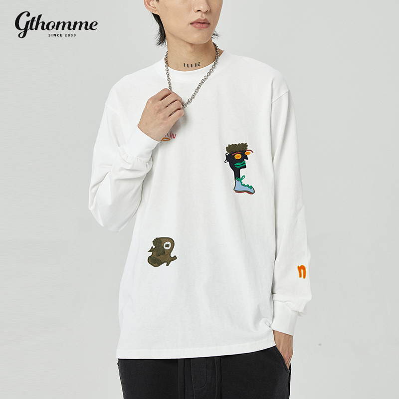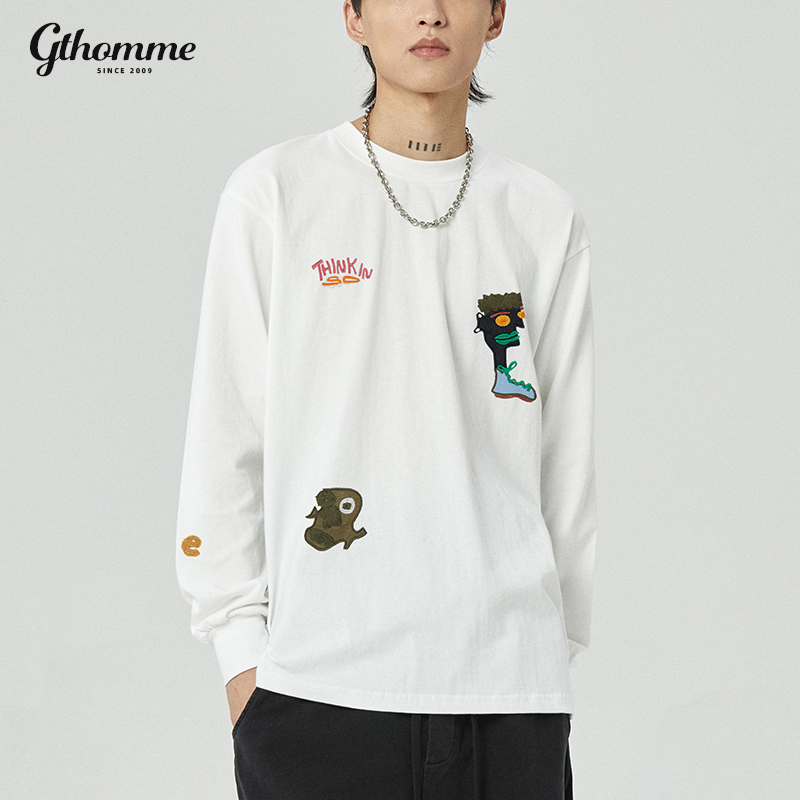 上衣 T恤男宽松圆领潮流刺绣休闲百搭白色打底衫 2025春秋新款 长袖