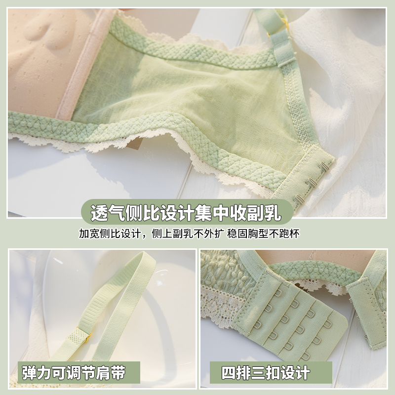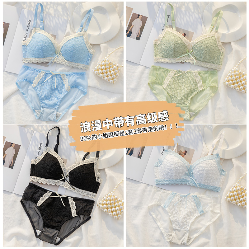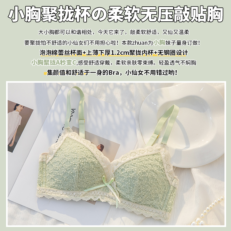 内衣女无钢圈小胸聚拢蕾丝性感薄款 大胸显小调整型黑色文胸罩套装