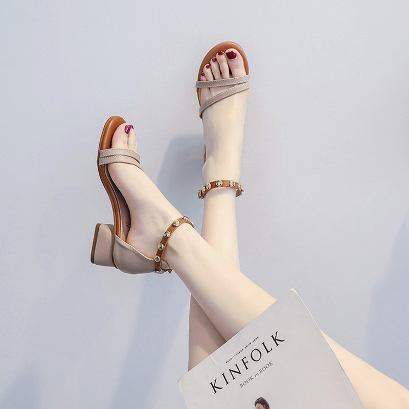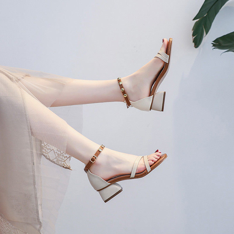 百搭仙女风粗跟中跟真皮一字带女鞋 包跟凉鞋 韩版 夏季 女2025年新款