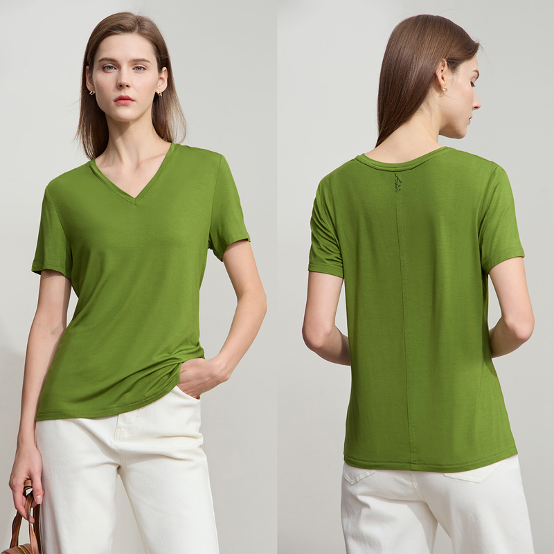 Amii2025夏新款 高弹套头T恤女 极简休闲百搭纯色V领绣花修身