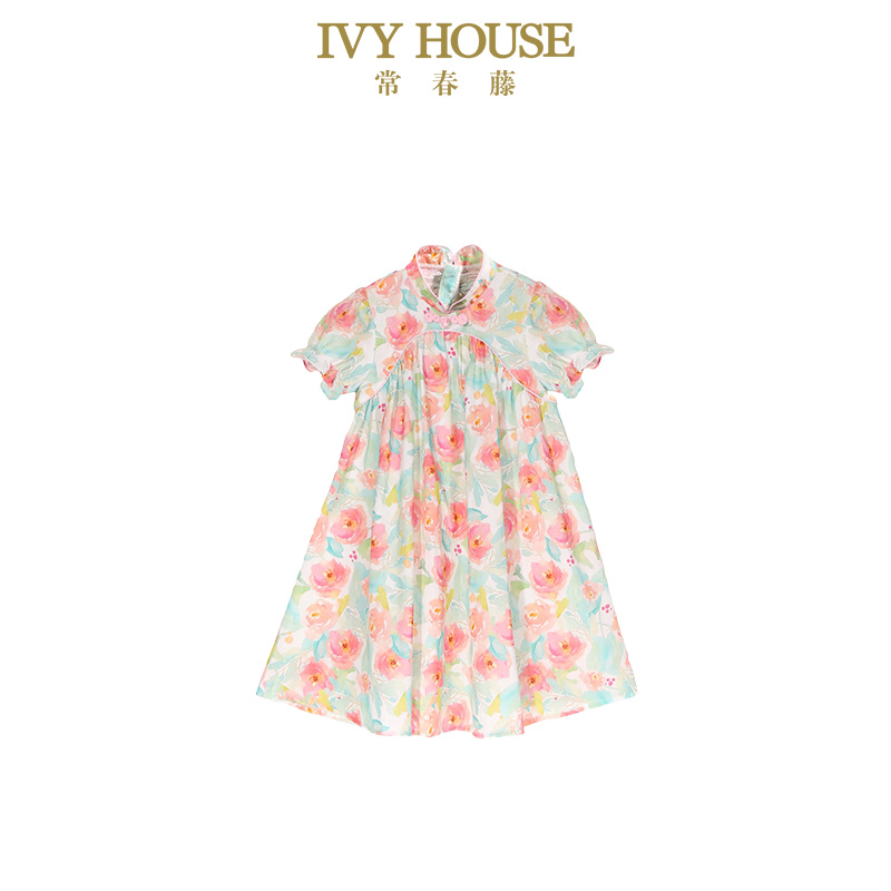 新中式 IVY 新款 女童夏季 印花旗袍裙棉麻连衣裙 HOUSE常春藤儿童装