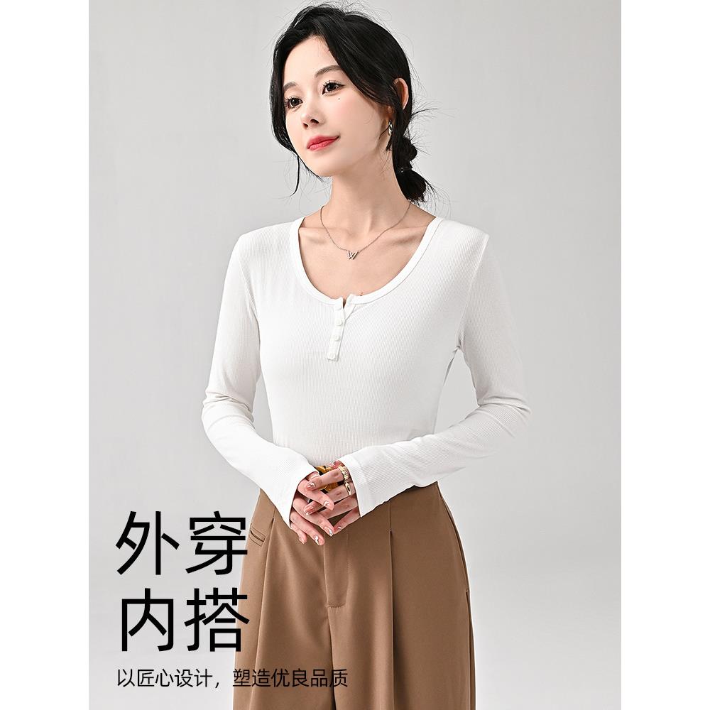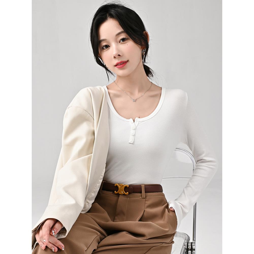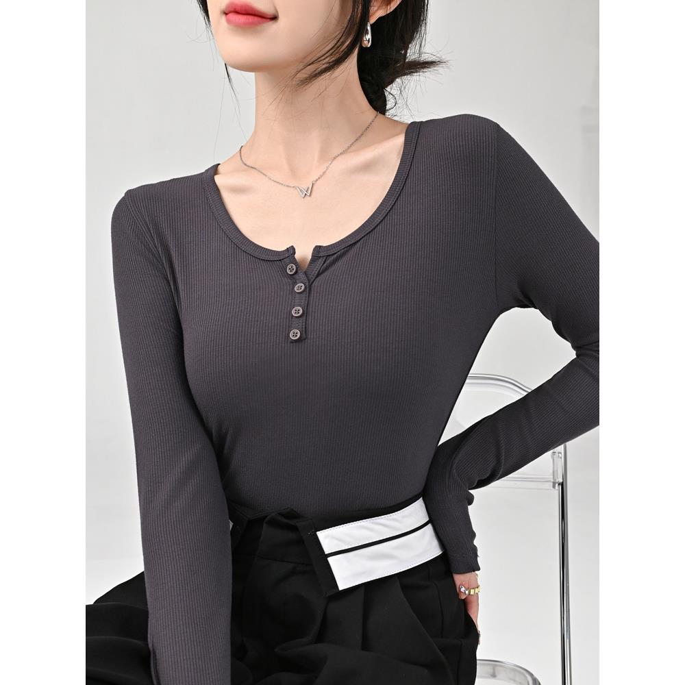 上衣定 设计感显打底衫 纽扣休闲螺纹温柔风正肩U领长袖 t恤女秋冬季